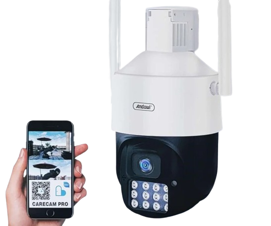This Andowl Q-S6 Max is a Wi-Fi PTZ security camera designed for high-definition surveillance. Featuring an 8K resolution with a 5MP image sensor, it offers motion detection, automatic tracking, and two-way audio. With a 355-degree horizontal and 90-degree vertical pan-tilt range, IP65 waterproof rating, and night vision modes (infrared, full-color, white light), it supports microSD storage up to 128GB and cloud storage via the CareCam app for iOS and Android. Its compact design with dual 5dB antennas ensures reliable connectivity up to 100 meters. Suitable for indoor and outdoor home or office monitoring.